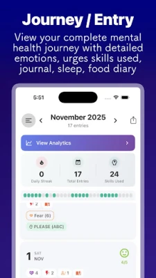 Εξερευνήστε μια πλήρη βιβλιοθήκη δεξιοτήτων DBT, κατακτώντας την Ενσυνειδητότητα, τη Ρύθμιση Συναισθημάτων, την Αντοχή στη Δυσφορία και τη Διαπροσωπική Αποτελεσματικότητα. Κάθε ενότητα περιλαμβάνει βίντεο, πρακτικές ασκήσεις και οδηγούς για εφαρμογή στην πραγματική ζωή. Ανακαλύψτε επίσης πάνω από 1.000 καθοδηγούμενους διαλογισμούς από κορυφαίους εκπαιδευτές, καλύπτοντας θέματα όπως η διαχείριση κρίσεων, ο ύπνος και η αυτο-συμπόνια. Το προηγμένο σύστημα παρακολούθησης ημερολογίου σάς δίνει τη δυνατότητα να προσαρμόσετε τι παρακολουθείτε και πόσες λεπτομέρειες παρέχετε, προσφέροντας έξυπνες αναλύσεις για να κατανοήσετε τις συνδέσεις μεταξύ της πρακτικής σας και της συναισθηματικής σας ευημερίας. Με μια κομψή σχεδίαση, λειτουργία σκοτεινής λειτουργίας και μια εργαλειοθήκη επιβίωσης κρίσης για άμεση υποστήριξη, το DBT Coach είναι ένα ολοκληρωμένο, κλινικά αυστηρό και οπτικά ελκυστικό εργαλείο, ιδανικό για όσους διαχειρίζονται άγχος, κατάθλιψη, ΔΕΠΥ ή απλά επιθυμούν προσωπική ανάπτυξη και μεγαλύτερη ψυχική ανθεκτικότητα.