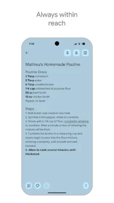 Με το Google Keep, οι ιδέες σας βρίσκουν τον πιο απλό και αποτελεσματικό τρόπο να ζωντανέψουν. Είτε πρόκειται για μια αυθόρμητη σκέψη, μια ολοκληρωμένη λίστα ή μια σημαντική υπενθύμιση, αποτυπώστε τα πάντα με πρωτοφανή ευκολία. Προσθέστε σημειώσεις, δημιουργήστε λίστες εργασιών, επισυνάψτε φωτογραφίες για να εμπλουτίσετε τις αναμνήσεις σας, ή απλά εγγράψτε μια φωνητική σημείωση – το Google Keep θα τη μεταγράψει άμεσα σε κείμενο, έτοιμη για αναζήτηση και επεξεργασία αργότερα. Η καταγραφή των σκέψεών σας είναι άμεση και απρόσκοπτη, χάρη στα γραφικά στοιχεία στην αρχική οθόνη του τηλεφώνου ή του tablet σας, αλλά και στα ειδικά πλακίδια και τις ενδείξεις για τη συσκευή Wear OS.