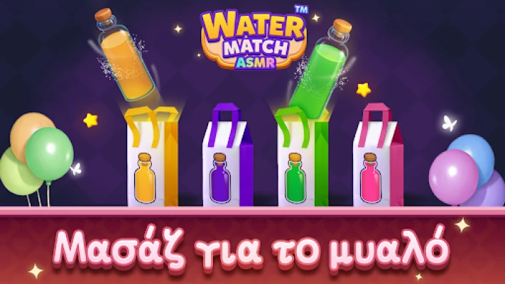 Γυμνάστε το μυαλό σας και χαλαρώστε με το Water Match™- ASMR Water Sort. Απολαύστε την ταξινόμηση νερού και χρωμάτων, βελτιώνοντας τη λογική και την παρατηρητικότητά σας. Μια εμπειρία ASMR για μείωση του άγχους και ψυχική ηρεμία, ιδανική για όλη την οικογένεια.